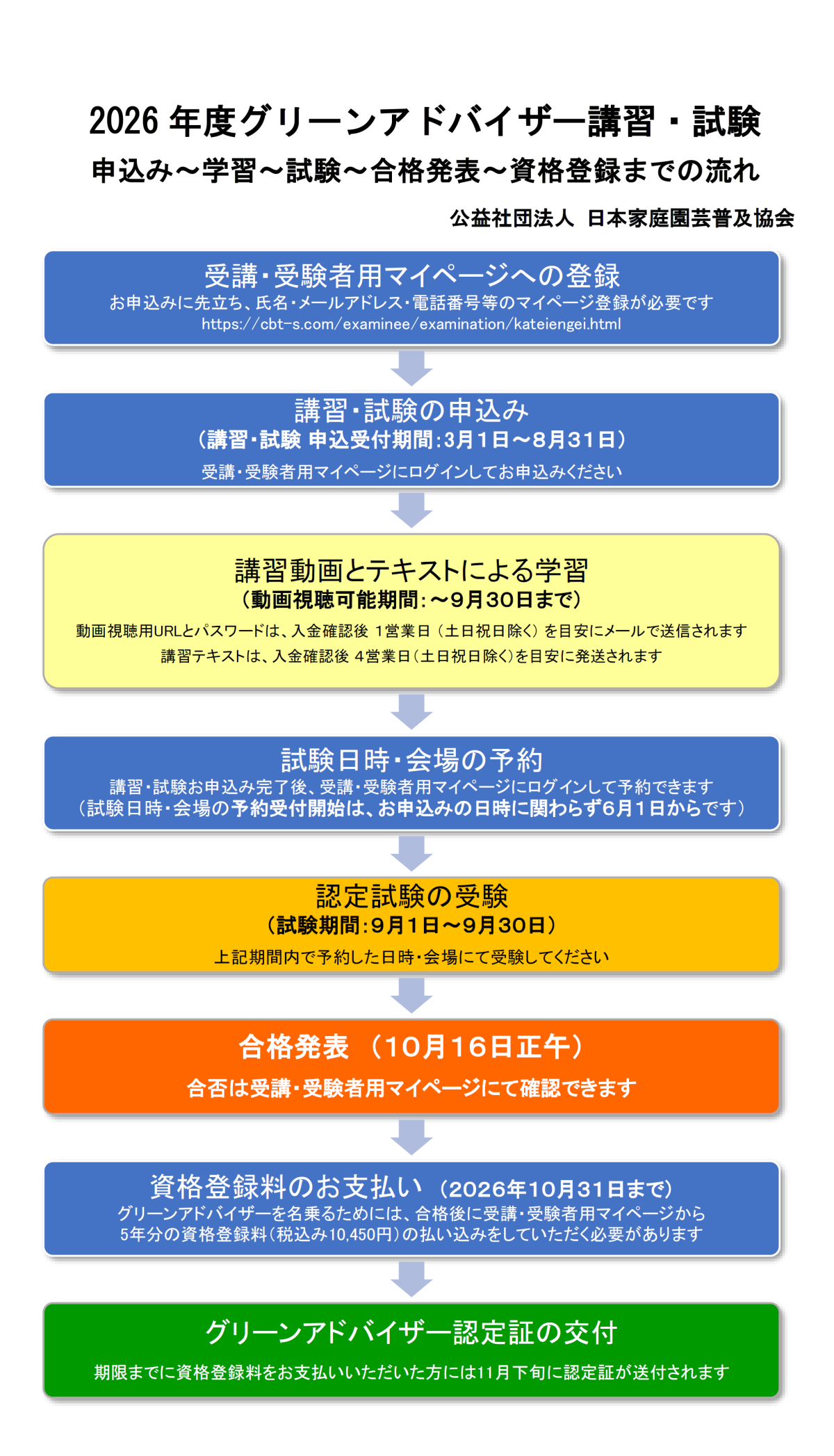 テキストとインターネット配信による講習動画の視聴を通じて学習し、9月にCBT方式の試験を受けていただき、試験合格後に資格登録手続きを経てグリーンアドバイザーを名乗ることができます。